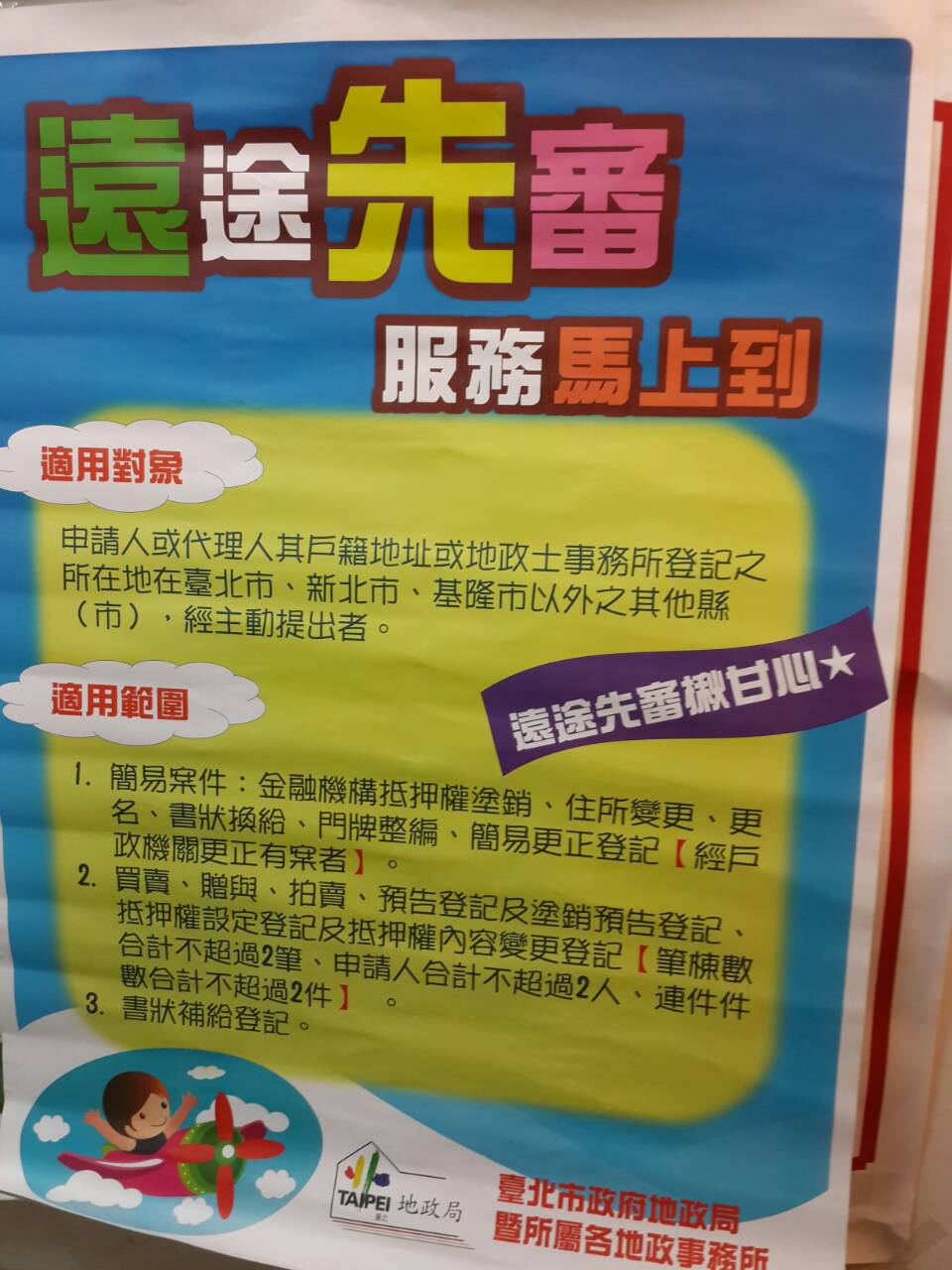 臺北市政府地政局所屬各地政事務所受理遠途申請人申請登記案件先行審查作業規定,自103年8月20日起實施附件-規定條文、流程圖