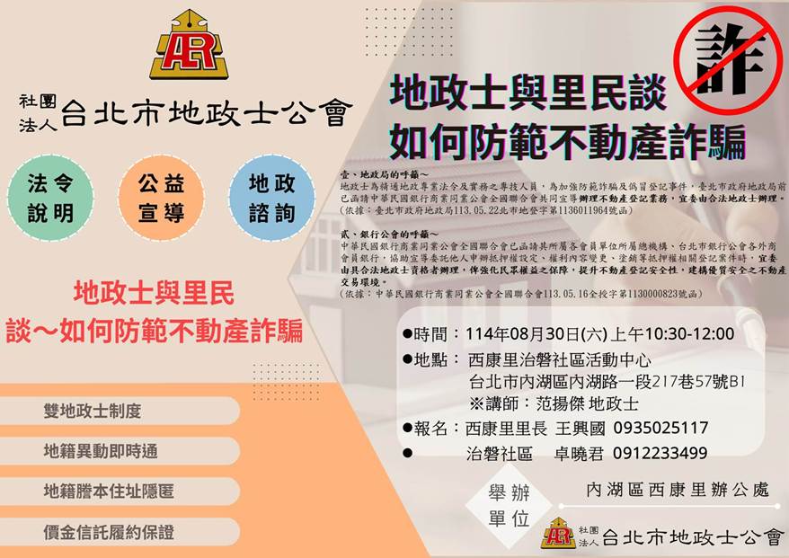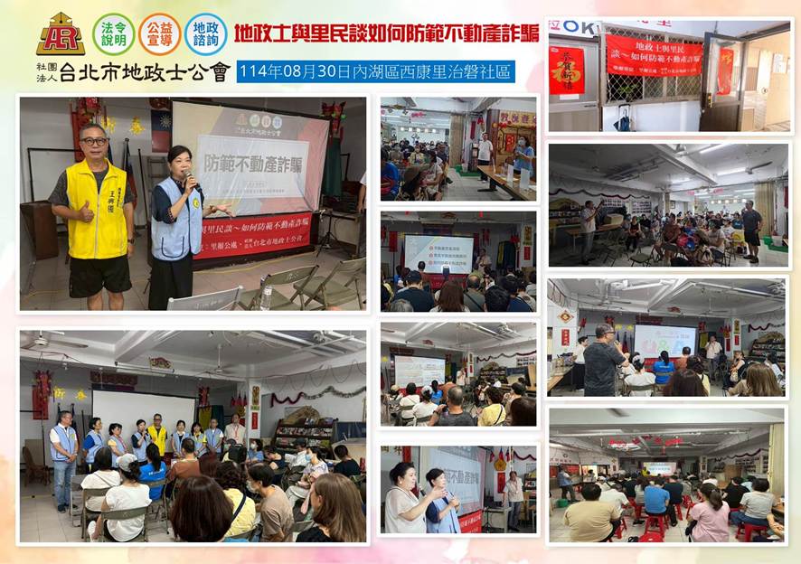 因應詐騙手法日新月異,受騙民眾及受損財產金額不斷攀升,台北市內湖區西康里王興國里長透過治磐社區管委會卓曉君委員,特別邀請台北市地政士公會治磐社區合作主辦『如何防範不動產詐騙』之公益說明會,透過最新不動產詐騙案例及破解方法與里民們分享,希望藉此提高里民朋友、長輩們的防詐意識、避免受騙上當。 台北市地政士公會講師范揚傑理事準備的簡報內容豐富,其引述的詐騙案例態樣非常多元,並特別提醒里民長輩避免因對巨額回報的貪念和急於獲利的投資心態,而落入詐騙集團的陷阱中,最終成為詐騙的犧牲品。 針對不動產如何防詐騙的方法,范講師向里民朋友及長輩們宣導、說明平時若需提供身分證影本給相關單位時應需要在該影本上加註使用用途之字樣。另外范講師亦極力向西康里里民朋友推薦可以運用公部門提供的措施:如地政機關之地籍異動即時通、第二類謄本申請地址隱匿,稅捐機關之稅籍異動即時通等(稅籍異動即時通目前僅台北市試辦中),以及在房產處分、交易時辦理價金履約保證或銀行價金信託;或辦理信託登記、屋主居所與戶籍地址應一致等方式來遏止被詐騙;針對民眾自行上網刊登出售且無抵押權設定之房產物件,容易被詐騙集團鎖定為詐騙目標,講師也特別提醒如銀行貸款還清不要急著辦理塗銷,如已塗銷完成,亦可考量是否向銀行申請辦理理財額度設定。目前公部門也宣導雙地政士制度,民眾可自行委託熟識或信任的地政士一起來辦理不動產交易,避免因不熟法令而受騙。 本場次公益說明會在王興國里長號召下,宣導現場環境雖無冷氣設備但人氣滿滿以座無虛席來形容一點也不為過。里民長輩積極加入該里之防詐群組索取范講師於本次宣導之防詐資訊,是一場成功的公益說明會。 |
