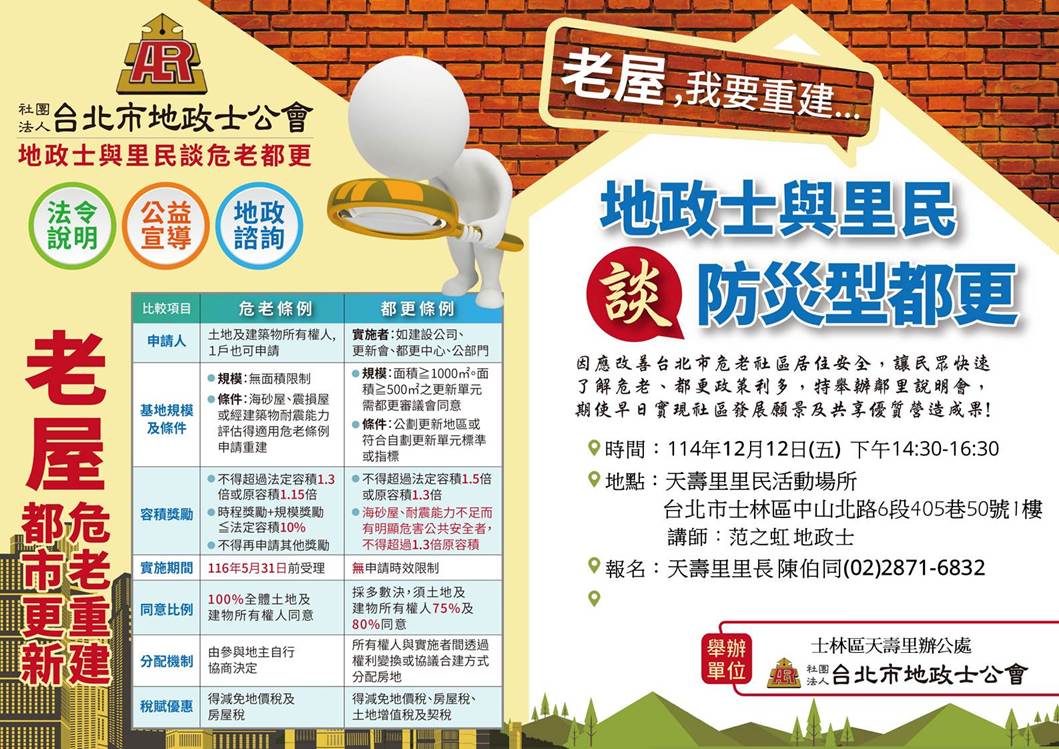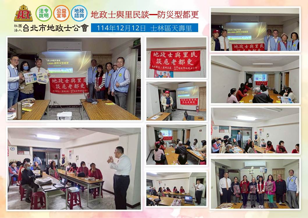 社團法人台北市地政士公會 全國首創! 地政士與里民談∼防災型都更114年12月士林區天壽里 總召集人-曾桂枝/專案召集人-范揚傑/專案副召集人:陳庠茂、黃士桂、陳筱玲 |